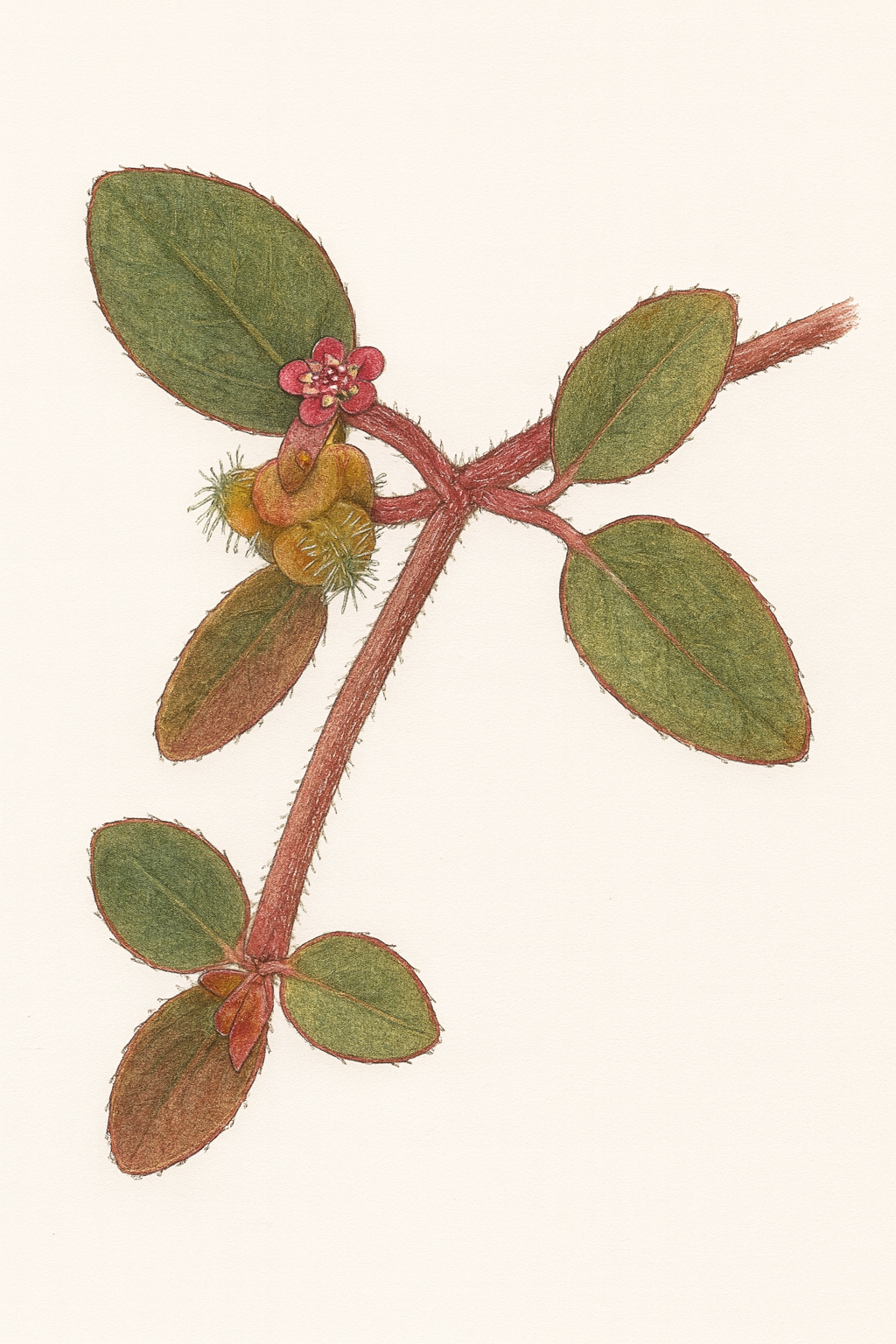 Aunque suele considerarse una maleza urbana, Euphorbia prostrata cumple un rol ecológico importante al aportar flores pequeñas ricas en néctar que sostienen abejas, mariposas y colibríes oportunistas en áreas perturbadas. Su rusticidad la hace adecuada para bordes de jardines y áreas de bajo mantenimiento, donde contribuye a la conectividad de polinizadores.