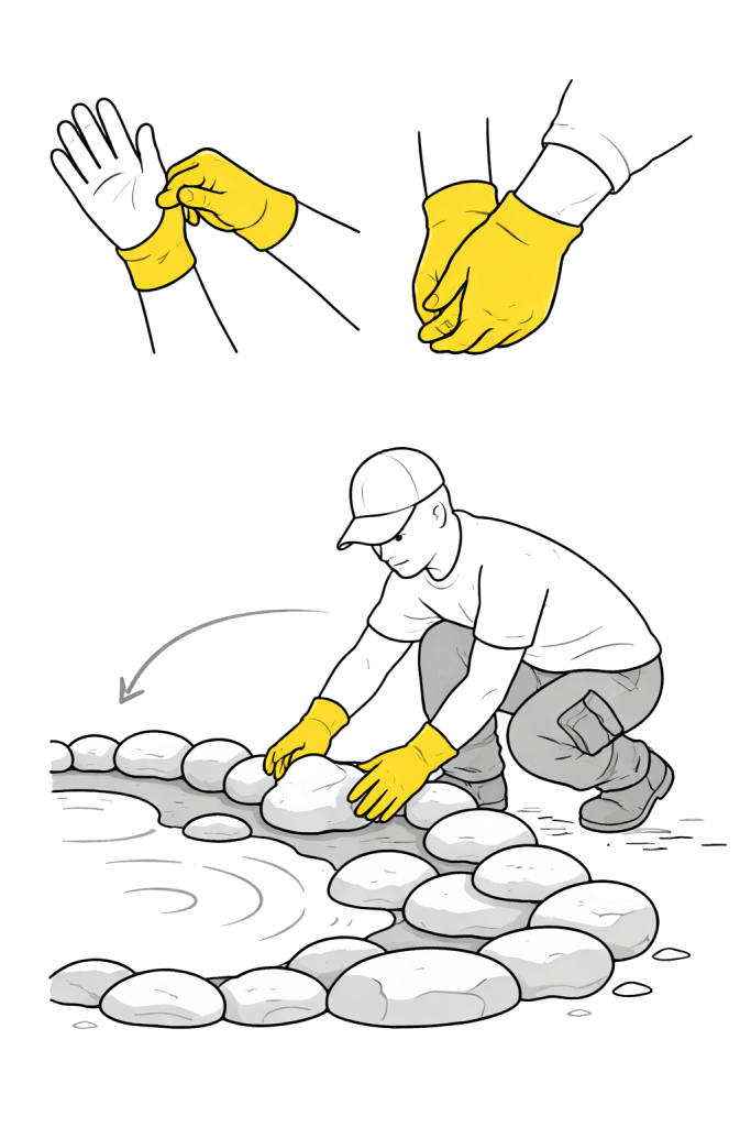 Manos a la obra: trabajar en equipo para dar forma a la base del estanque, acomodando la piedra con calma, atención y colaboración.